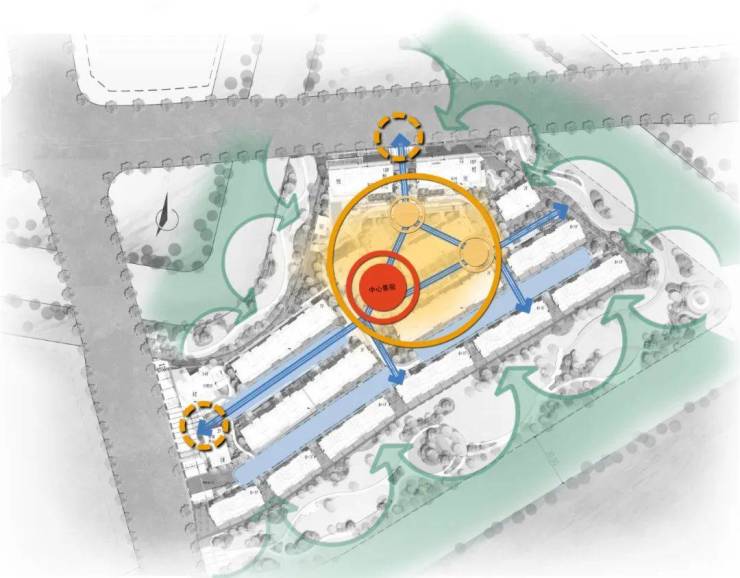 项目总体布局体现为“一环、两轴、三围合”的设计构思。一环”是指连接小区主次入口的主环道以及形成小区中央的大花园,“两轴”是指贯穿小区东西和南北两条相交的主要景观轴线,“三围合”是指小区南侧有50米城市绿化带,东侧和北侧均有20米城市绿化带,三面均被景观绿化带和东侧的长山直河、南侧的官河,北侧的郎家浜河所环绕,自然景观俱佳。