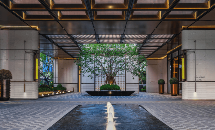 项目归家门庭沿 街展 面 约100米 ,比正常大几千万的豪宅更具视觉冲击力极强,并采用高奢酒店“环岛式”落客流线,并用采用 贝金米黄石材 铺就 。