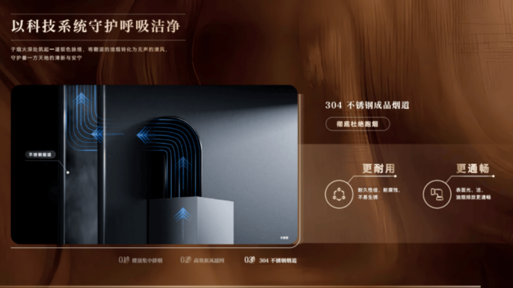 ◎ 衡洁:清鲜如一的全域呼吸。摒弃传统水泥烟道,升级 304 不锈钢烟道系统,从结构上消除回烟与异味困扰;搭配多重滤网新风系统,PM2.5 过滤效率超 98%,让每一次呼吸都清新畅然。