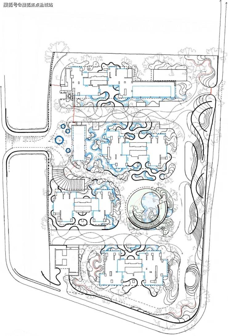 形象取决于空间,设计在花园里做的不仅仅是水,而是创造空间,让其流入每栋建筑,并可以带领人们从一个地方到另一个地方。水没有任何颜色,但如果把深色物质放在水下,它就会变成镜子,这也是设计想将建筑整合进水中的创意。