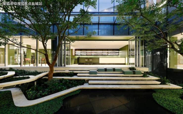 取意钱塘江流动韵意,平面上设计师用柔和的曲线巧妙地将形式与功能结合在一起,创造一个连续与无界的流动空间。除此之外,呼应建筑流动线型设计,巧用高差造景,融合美学与生态,带来有趣的步行体验,将自然以伟大交响曲的流动形式植入潮博。