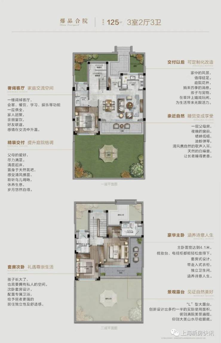 示意图绿城望竹山,以约125㎡的建筑面积,就轻松做到了上下两层,这在以前的绿城小镇产品当中,可以说“绝无仅有”。绿城望竹山125㎡户型做到了上下两层,拥有三室两厅三卫舒适格局,在保证实用功能基础之上,再次降低了蓝城两层中式院子产品的准入门槛,而且,在空间尺度上也丝毫不输之前150㎡左右的两层中式院子产品。一经推出,便吸引了大批长三角蓝粉的关注。▲建筑面积约125㎡中式合院户型图独门独户独院,1-2层楼形式,是低密产品的黄金楼层。表面上看,两层院子比单层院子多了一层,但就是这一层却为生活平添了许多乐趣。二层中式院子,比一层中式院子拥有更多居住乐趣。但将建筑面积由150㎡,压缩到125㎡,是否会影响到居住舒适性?这个问题交给尖子生——绿城来解,大可不必操心。绿城望竹山建面约125㎡户型,面宽做到了约9.2米。这个尺寸在众多同样的户型面积段内,非常突出。要知道,许多建面约250㎡的院子产品,面宽也只有9.6米。绿城这个125㎡户型做到了三房两厅三卫,更难能可贵的是做到了双套房设计,如今,多数家庭经历从二人空间,到三、四口之家,再到三代同堂(接父母同住),可能仅仅就在10-15年之内的事情,所以,一个套房设计已经远远不能满足家庭需求。望竹山的双套房设计,既可以让全家人住得更舒适,又能避免一家人早晨争抢卫生间的尴尬。房间多,房间尺寸也丝毫不含糊。绿城望竹山建面约125㎡户型,主卧的面宽达到近4.1米,放下2米长大床后,仍有充足空间留给电视柜和过道,除了配置卫生间外,还设置了走入式衣帽间……,这个户型让客户在约125㎡的建筑面积内,也能住出“壕”的感觉。更惊人的是,主卧自带的“L”式观景大露台,创新设计出多约一半的实际使用面积,功能甚至超过了以往绿城建面约150㎡中式院子的露台面积。如果折算成房价,这片多出来的灰空间,相当于为业主省下了40余万!随着绿城院子产品的不断迭代创新,只要条件允许,就买两层中式院子,成为越来越多蓝粉的共识。如果换做在市区高层,建面约125㎡的房子受公摊等因素影响,连大平层都谈不上。而绿城望竹山建面约125㎡两层院子产品,不仅拥有前面提到的超高得房率,三房(两套房)两厅三卫的豪华格局,而且,还拥有一个令现在都市人难以抗拒的院子。示意图林语堂曾经在其书《我的愿望》中写下:“宅中有院,园中有屋,屋中有院,院中有树,树上见天,天中有月。不亦快哉!”世界再大,不过一个院子,但现在市场上存在的迷你中式院子产品,庭院面积只有约30—50㎡,配置这样的庭院,只能说聊胜于无,是很难真正展开一些生活场景的;而在望竹山项目,庭院面积高达60-280㎡,可以满足你对生活的无限想象。示意图住在一层的长者,房间直接与庭院相通,清晨起床,天然氧吧,练练太极,最适合老人不过了;孩子在院子里踢足球,宠物在草坪上自由奔跑;父母在院子里耕种时蔬,采摘瓜果,每个人都能在院子里找到自己的喜好,找到自己的精神皈依。示意图望竹山125㎡两层中式院子,上看云卷云舒,下看亭台水榭,俯揽四季景致,统统都是眼前真实的存在。要诗意有诗意,要生活有生活,是房子,更是院子。其实,很多人对中式院子的执念,源于国人文化自信的复兴与自古传承下来的审美习惯。然而,这类产品的高总价往往劝退了大量城市中产。在某大v的文章里,曾梳理过杭州部分“两层中式”的起步总价:市中心合院预计2000万起,其他区也要1000万以上……相比之下,望竹山的价格简直太亲民,总价只要395万起,就能拥有一方属于自己的、精准交付的(带中央空调、地暖、户内净水设备)、有天有地的两层中式院子。项目地处在安吉城南生态谧境,三大国家4A级景区之间。在安吉加快“接沪融杭”的时代大背景下,杭州与安吉的交通距离一缩再缩,S14杭长高速、申嘉湖高速可方便通达,加上安吉即将迎来双高铁时代,融杭接沪更近一步。即便把春风十里作为第一居所,也能轻松实现理想中的“双城生活。“采菊东篱下,悠然见南山”,这种陶渊明式的生活理想,如今正随着像蓝城·春风十里这样的一个个小镇的画地而起,与城市中产有了越来越多的交集和邂逅。