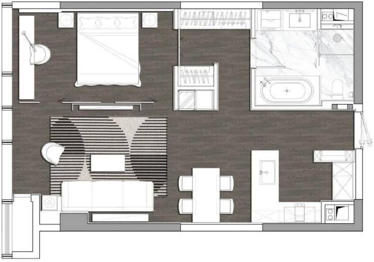 C户型包豪斯大师经典家具与意式品质的结合,金属、玻璃、橙色皮革,以及几何波点,与温暖的木制品相得益彰,凑出一曲和谐的交响曲,通过线条来塑造空间感,整体更加时尚和灵动,彰显独特的尊贵感60㎡的房子,160㎡的尺度。