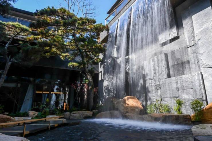 水流从高处倾泻而下,如同一条白色的绸带在空中飞舞,最终跌落成瀑,又随山流转成溪,高度还原了寄畅园空谷跌瀑、流水似琴音的精妙场景。