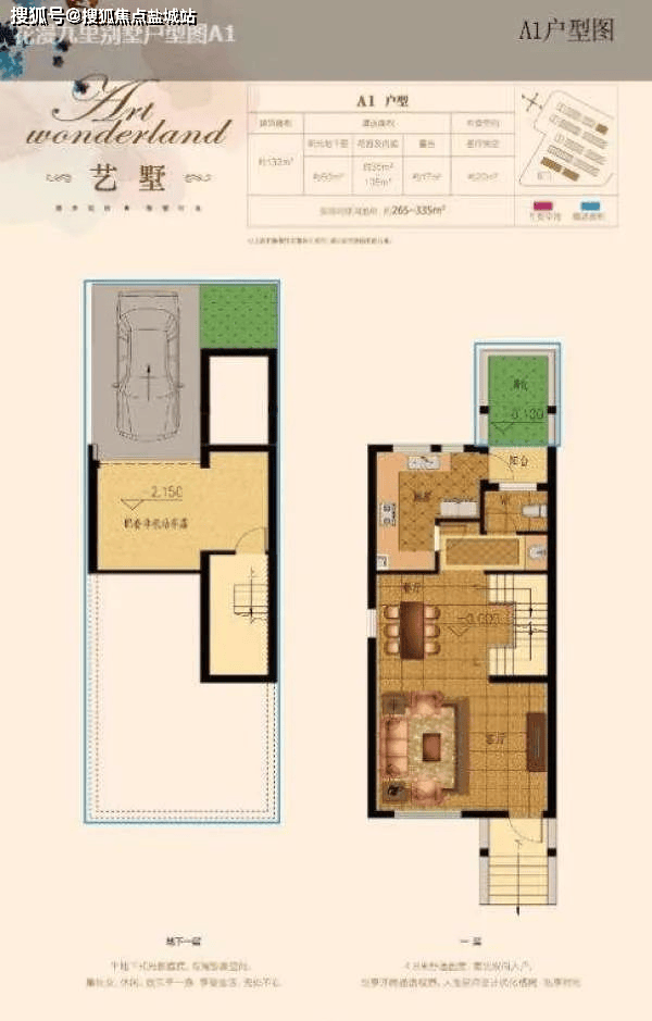 A户型建筑面积:131㎡赠送面积:阳光地下层60㎡,花园及内庭35-105㎡,露台17㎡,客厅挑空20㎡实际可使用面积:约265-335㎡