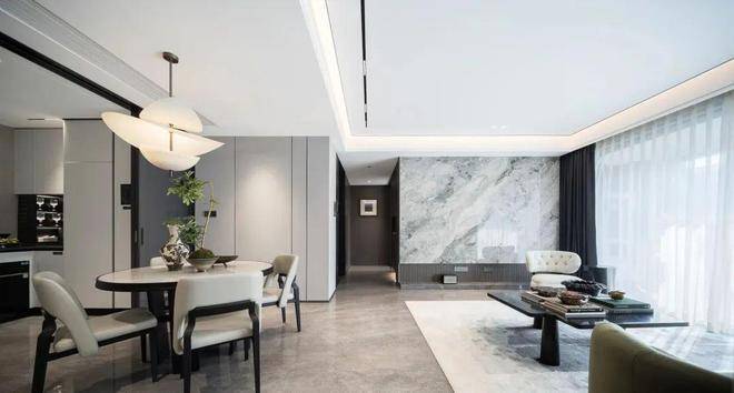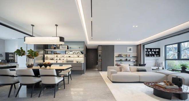 走进客厅,印象最深的除了大手笔岩板背景墙,就是区域唯一的悬浮吊顶,得益于标准层3.1~3.15米层高,一楼更是做到3.6米层高,即便做了吊顶,也丝毫不影响大宅气场。