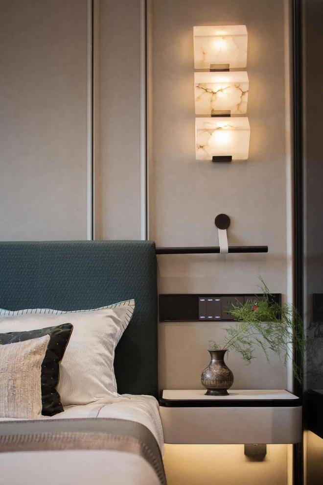 主卧背景墙更是重量级,定制床头皮质背景墙,材质选用比传统皮革更加柔和高级的的哑光麝皮绒皮革,搭配爱马仕线条,豪宅范十足。