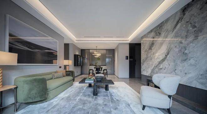 同时,电视背景墙也是一整块西西里翡翠岩板,还有申请了国家专利的东方云纹岩板,建面约238㎡更是整块玉石(原石材),全苏州仅此一家!