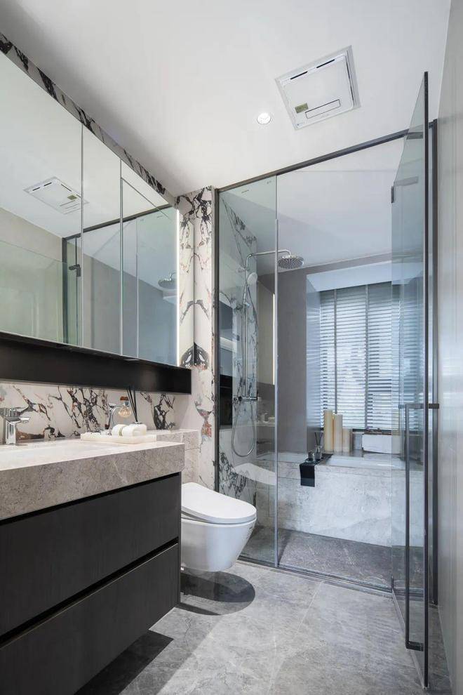 你可能想象不到,在尚云赋房间里几乎没有一面墙是乳胶漆,要么是定制墙布,要么是岩板,就连卫生间都用一整块经典宝格丽岩板,拼接缝都处理得非常精致。