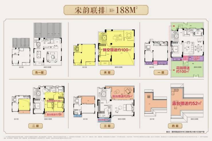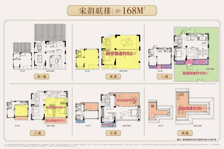 208㎡户型:最大实得面积突破800m²,空间利用率刷新客户想象!立体分层设计更显匠心:负一层可打造酒窖与多功能娱乐区,成为亲友聚会的私密场域;夹层挑空赠送约108㎡,可规划品茗区、棋牌室或书房,满足个人兴趣需求;一层超大花园和额外附赠约196㎡使用空间,让公共区域更显阔绰;餐客厅挑空二层赠送约43㎡,搭配约13㎡露台,可拓展为卧室或休闲区;三四层合计赠送约77㎡露台与阳台,可打造空中花园,让生活场景无限延伸。