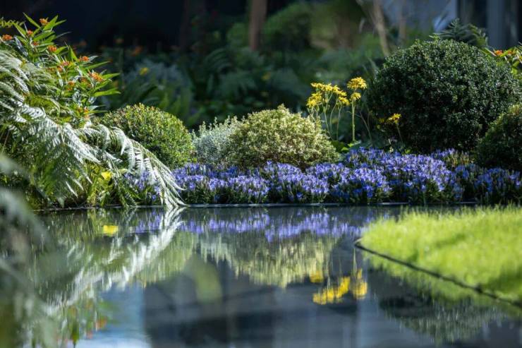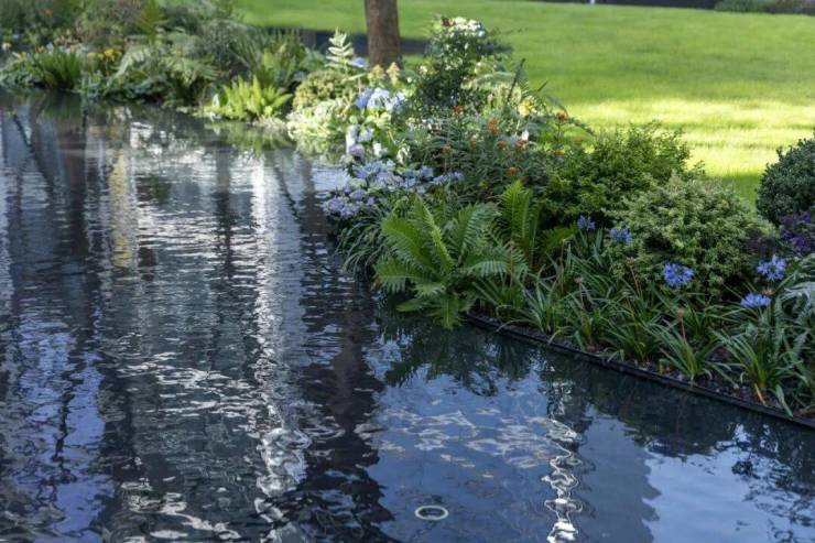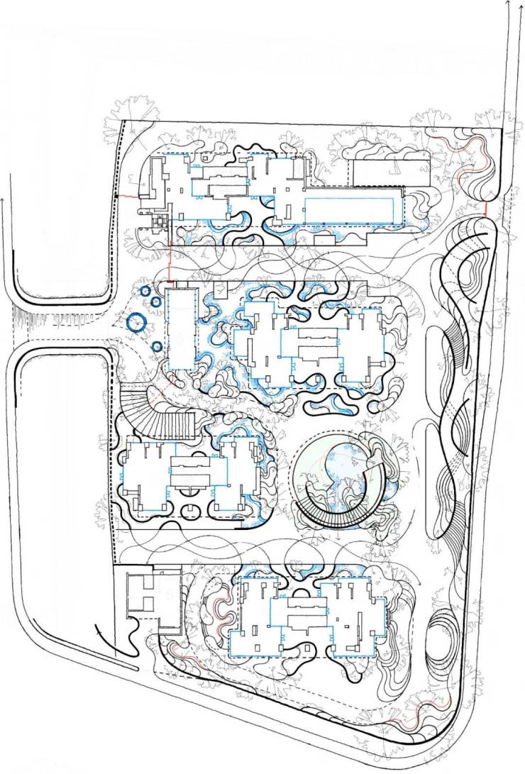 形象取决于空间,设计在花园里做的不仅仅是水,而是创造空间,让其流入每栋建筑,并可以带领人们从一个地方到另一个地方。水没有任何颜色,但如果把深色物质放在水下,它就会变成镜子,这也是设计想将建筑整合进水中的创意。