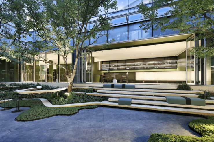 取意钱塘江流动韵意,平面上设计师用柔和的曲线巧妙地将形式与功能结合在一起,创造一个连续与无界的流动空间。除此之外,呼应建筑流动线型设计,巧用高差造景,融合美学与生态,带来有趣的步行体验,将自然以伟大交响曲的流动形式植入潮博。