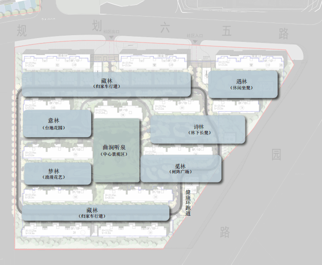 十庭:中庭景观会客厅(风漾碧浪) 、口袋花园(五感花园) 、儿童活动场地(童梦流萤) 、景观会客厅(树影烁光) 、洋房庭院(倚风园) 、南侧组团花园(乐丘漫步) 、高层花园(泛云园、翠微园、寻幽园 、卧月园)