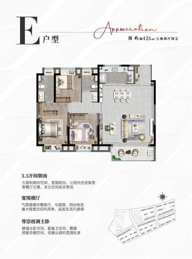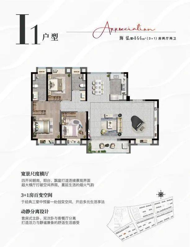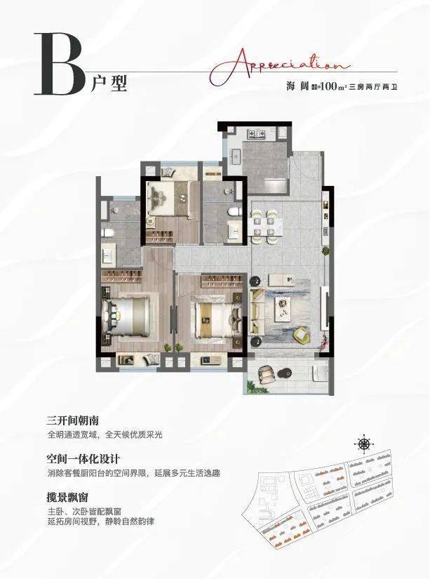 上实·听海首推建面约100-144㎡全生命周期户型,用更科学的空间尺度诠释改善人居的可能性,更以全飘窗设计,更好的感受超大海景界面带来的瞰海居住体验。