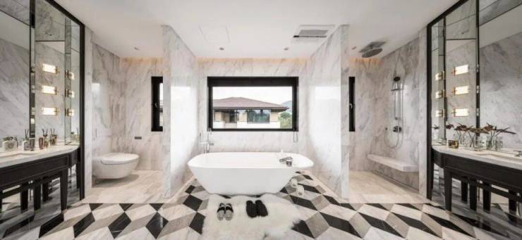 来到二楼,大部分人会被主卧5.3米的奢阔穹顶所震撼。而走到步入式酒店卫生间,很多人一眼就会发现,这与曼谷高奢度假酒店The Siam的卫生间如出一辙。都是采用黑白配色的石材拼接,卫生间正中放置了一个独立浴缸,双台盆分列左右两侧。