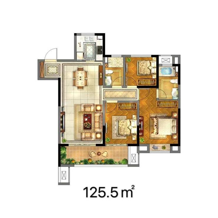 目前在售产品涵盖毛坯高层住宅,主力户型为建面约112㎡三房两厅一卫与124㎡三房两厅两卫,满足不同家庭结构的居住需求。