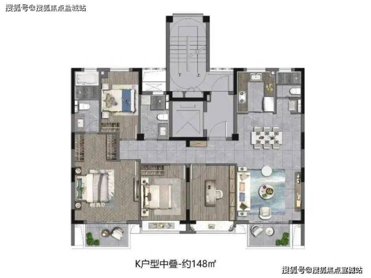 除此之外,项目还有建面约135㎡3房2厅3卫上叠、建面约148㎡4房2厅3卫中叠以及建面约148㎡4房2厅3卫下叠。叠墅产品上有露台下有庭院!