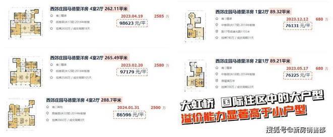 一方面,大虹桥有标杆项目珠玉在前。比如西郊庄园马德里洋房,其90㎡二手房成交价约7.5万/㎡,但260㎡就高达约8.6-9.8万/㎡,大户型溢价更高。