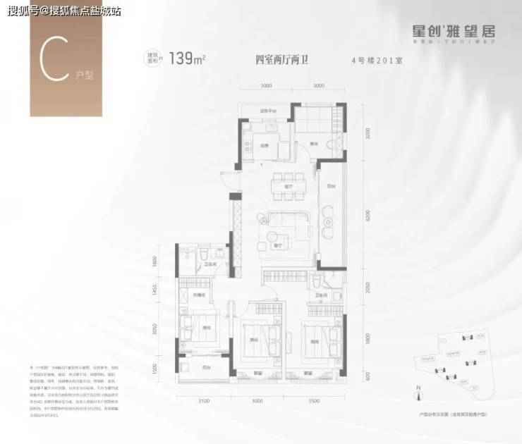 该户型为项目的139方四房两厅两卫户型,是边套设计。建筑面积约139㎡的户型作为压轴产品,更适合二胎家庭,三代同堂也游刃有余。