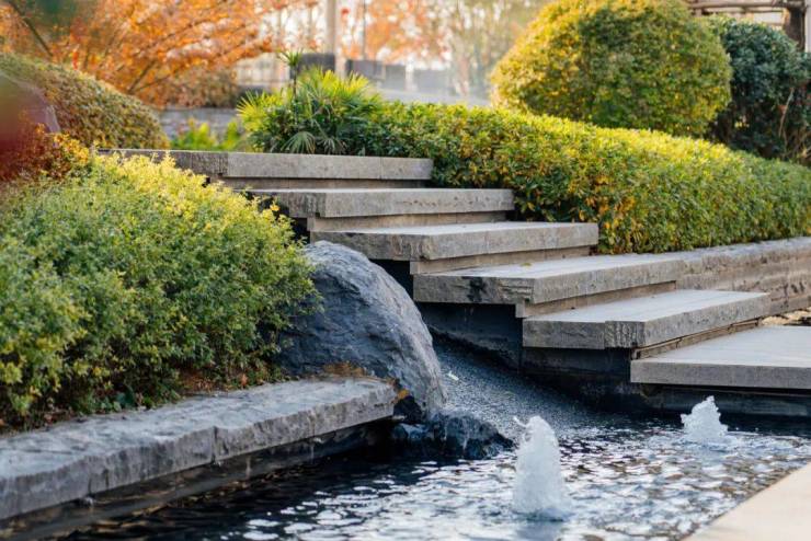秘境花园徐徐展开,缓坡水景结合鲜氧雾森系统,绿植与雾气缠绕交织,霎时间疏林草地间雾气弥漫,漫步其间。风雨连廊+下沉式会客厅,更加彰显格调。