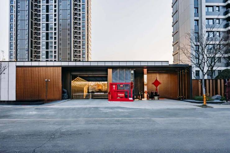 来到小区大门,长约62米、高约5.7米显赫威仪府门,由月光米黄石材、铝板、古铜色不锈钢等材料锻造,重现府宅门第礼序,开启业主归家第一重尊礼,仪式感满满。