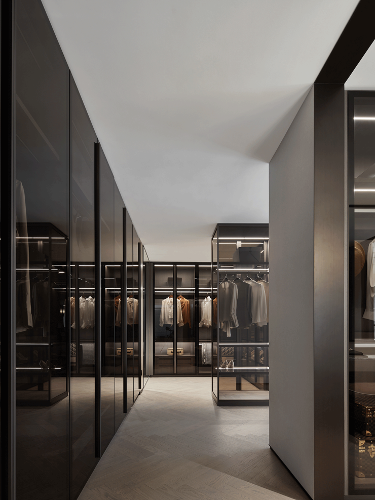 从主卧延伸至主卫的步入式衣柜,给予空间更强烈的结构感,对设计美学和功能主义的揉杂进行重新诠释,也将精致生活的幸福主旨排列而开。深色玻璃和金属边条的搭配,给予一丝神秘,透露出隐逸内敛的调性。