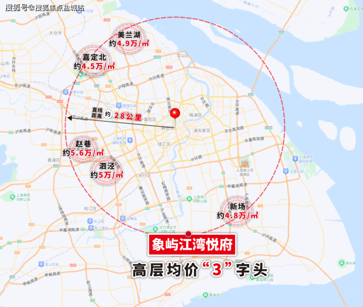 以相同半径画圈,同一纬度的圆周板块,新房价格普遍约4.8万/㎡,部分超过5万/㎡。