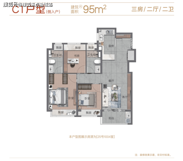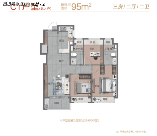 项目建面约95㎡为3房2卫,功能性强,双卫设计,生活更加从容。