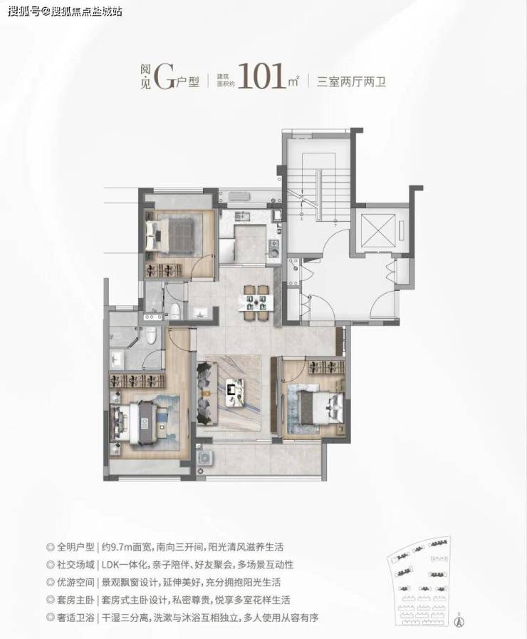 ③建面约101㎡H户型:三面采光,全能景观王炸边厅户型!