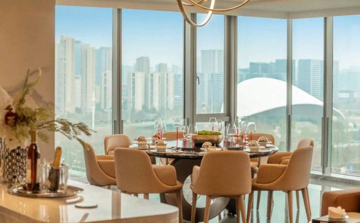 站在落地窗前,私人的视角,却是都会风景的大开大阖。近看是对面紫荆天街的繁华璀璨;直线距离约500米处,是同样系出蓝城的运河亚运公园,形似“江南油纸伞”曲棍球馆和“良渚玉琮”国球中心风华挺立;远眺,则是半座城市的瑰丽风光。