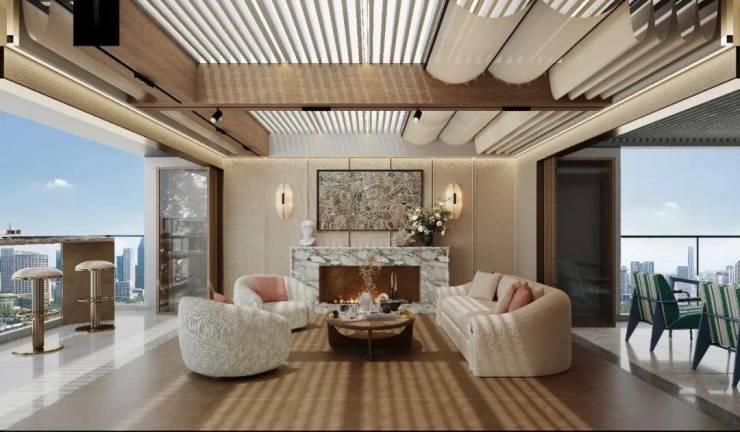 约2000方高定会所,谨为100户当代名望私享。以宋韵美学为底色,对望垂直山水庭院,融合空中私宴厅、恒温泳池、艺术雅集等,为塔尖构筑一方风雅际会、圈层交流的精神场域。