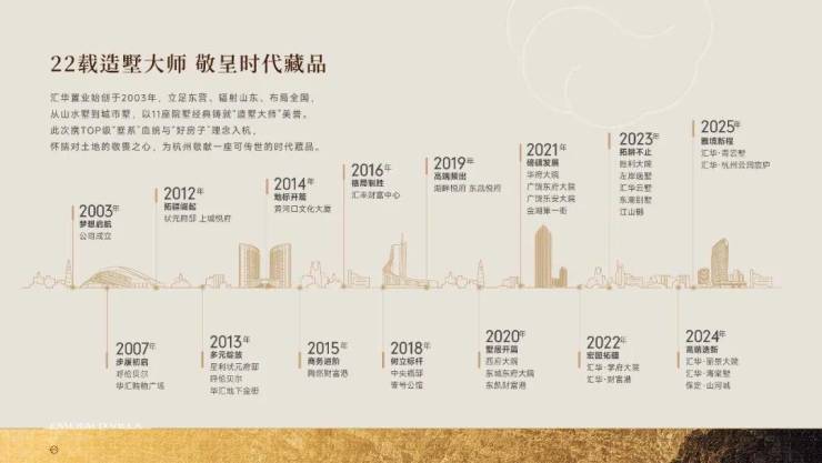 山东汇华置业创立于2003年,立足东营、辐射山东、布局全国,业务涵盖房地产开发、资产运营、物业服务等领域,现已成为具有行业影响力的综合性城市服务商。开创“府系”、“院系”、“墅系”三大高端产品线,从山水墅到城市墅,经典铸就“造墅大师”美誉。