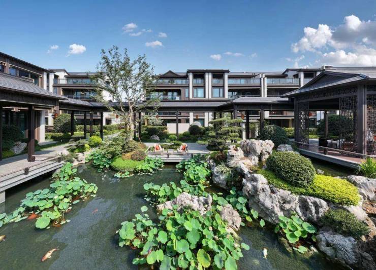 这个项目是杭州少有,也是板块唯一的纯叠墅项目中,配备地下恒温泳池和健身房的,把高奢酒店的服务配套搬到园区里。至于景观,贝尔高林设计,也是为许多买家吃了一颗定心丸。穿过高墙院门,你就迈入了溪映听庐将近几千方的中式景观园林。滨江利用天然坡地高差结合后期景观,呈现了游廊、亭台、繁花、叠水、鲤湖诸多中式意象,移步异景。