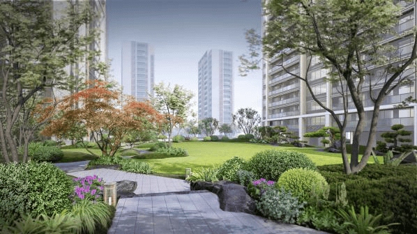南北书院礼序轴,东西文风礼序轴,纵横双轴交织,铺展约2000㎡阳光大草坪、约450m樱花漫步道、约600m健身慢跑环,错落点缀入口水浮庭、四季花园、氧气森林、儿童乐园……居中聚合态势,又保持各景观节点的独立,一步一景的可游赏、可体验式公园生活,营造出“张弛有度”的栖心人居场景。