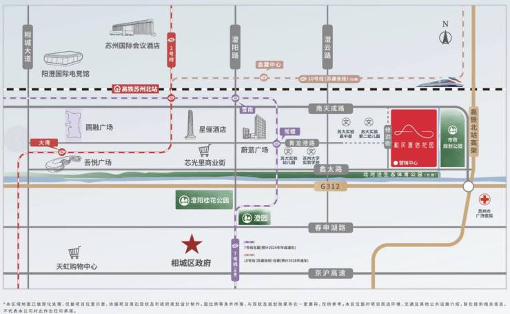 项目临近地铁7号线常楼站(预计2024年年底通车),4站相城区行政中心,10站中央公园;另外地铁2号线、4号线已开通运行,地铁10号线、12号、13号、15号线尚处规划阶段《苏州市轨道交通线网规划(2035)》。北侧南天成路,南侧G312国道,直上高铁新城立交,形成“中环+轨交+高速”的立体交通网络,快速通达园区、古城等苏州各个城区和苏南硕放国际机场等交通枢纽。