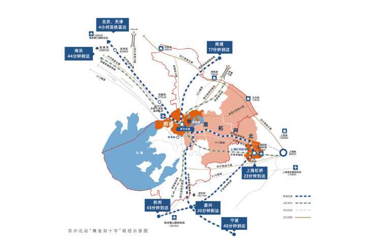 “黄金双十字”枢纽,1.5小时城际交通圈,与上海虹桥枢纽共同打造国家级高铁复合枢纽,13站台30bu线,促进沪苏协同。