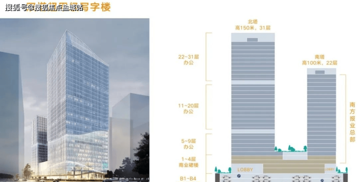 ◎在售产品介绍:北塔的中高区(11-20、22-31 层),约330-3000㎡高效商务空间