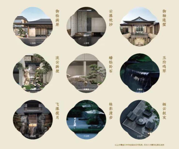御松画屏——云瀑枕纱——御轴连璧——流云画壁——蟠松卧石——玉阶鸣琴——飞瀑揽月——林影漫步——栖云叙友