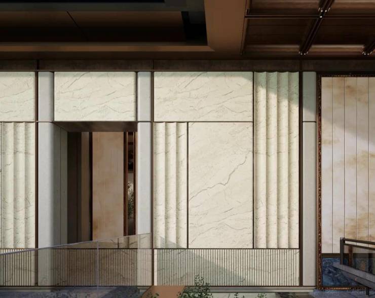 解构重檐、挂落、悬鱼等中国古代代表性建筑元素,并提取鸡血石、天目盏等吴越瑰宝之形意,以现代工艺技法予以转译重构,让东方美学与吴越文化的千年积淀,转化为可触摸的建筑美学。