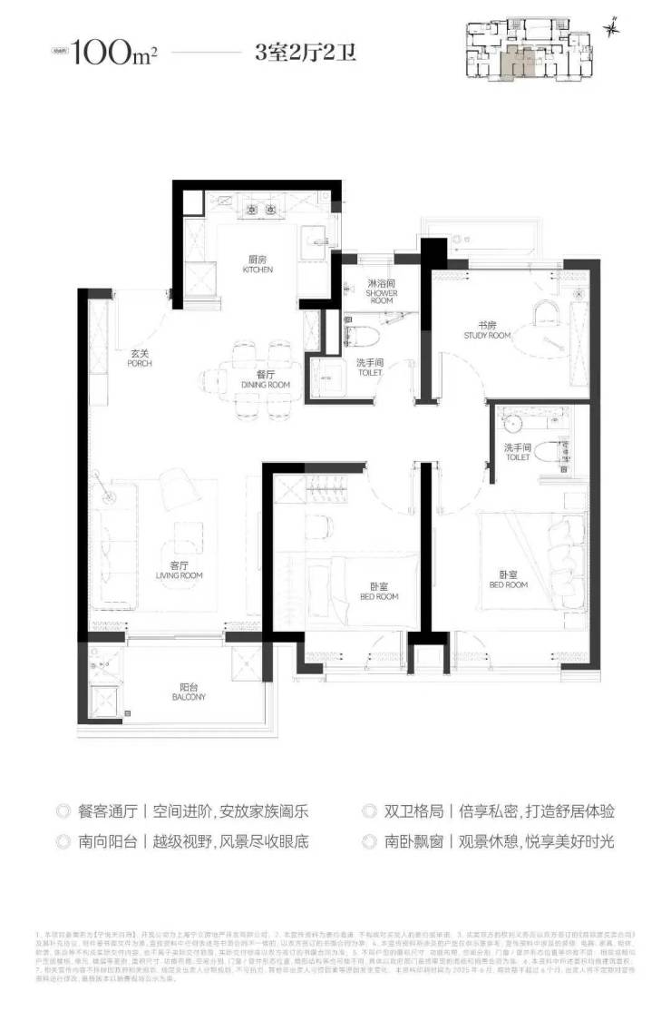 - 100㎡多功能三房:独立家政间与双套房配置,主卧270°转角飘窗揽尽苏河烟波;