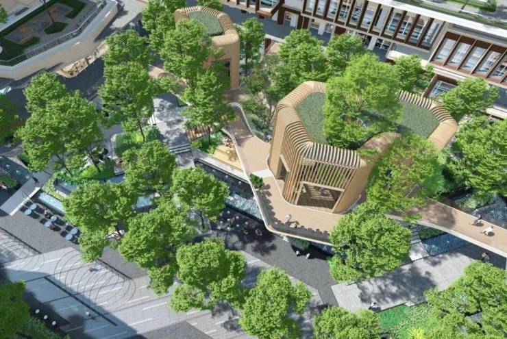 约 6100㎡高线公园:悬浮于约11-15米高空的立体绿廊,以古巴比伦空中花园为灵感,设置 “三大花园・六个游园”,种植乔木、灌木及攀援植物,形成垂直绿化矩阵。