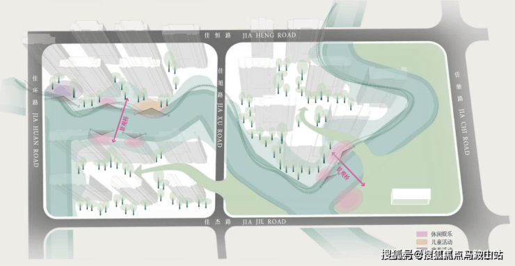 比如结合不同季节,选择四季植被铺设,沿着两条河岸线布置,四季景观皆不同。