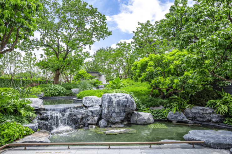 溪悦组团以宋代第一名画《溪山行旅图》为蓝本,用千万重金打造了“一园五境”可赏、可游、可居的现代东方园林,同时融入宋代山水画中溪流、置石、古树名木等元素,形成一道叠山理水的亮丽风景。