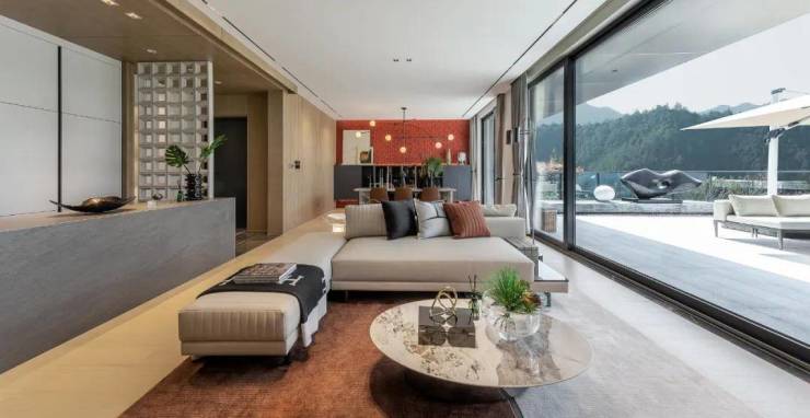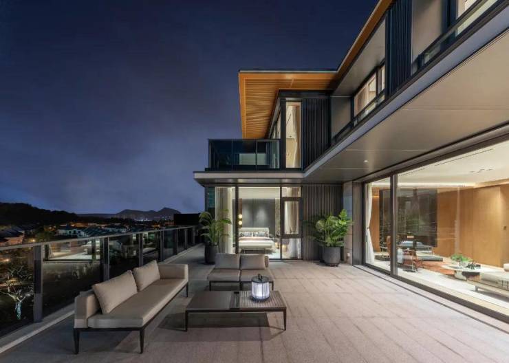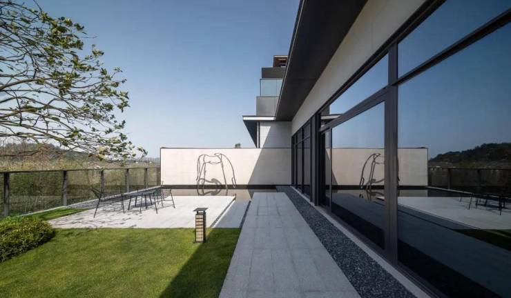 建筑外观方面,轻薄且层次分明的檐口设计展现出一种舒展、大气而又不失飘逸灵动的韵味。简洁明了的几何线条与和谐的色彩搭配,与青山湖的自然风光相映成趣,共同营造出一种精致而现代的生活氛围。