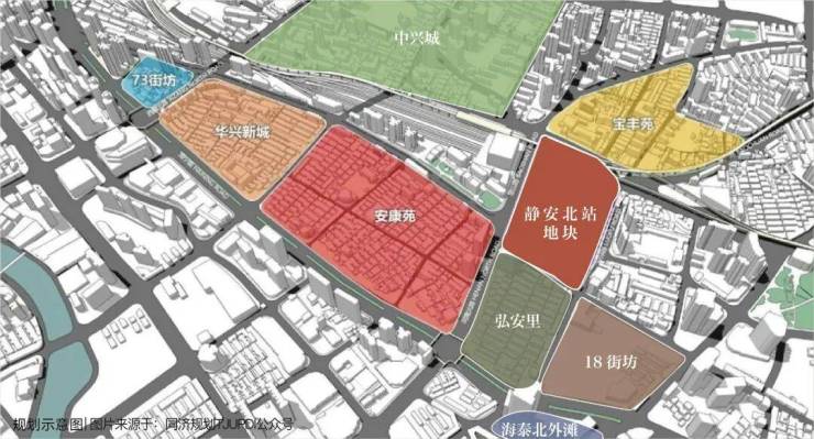 2010-2017年,上海市人民政府共确定了44片历史文化风貌区、250处历史文化风貌保护街坊。静安北站地块旧址北站新城作为约250处风貌保护街坊之一,位属二级新旧融合范围。