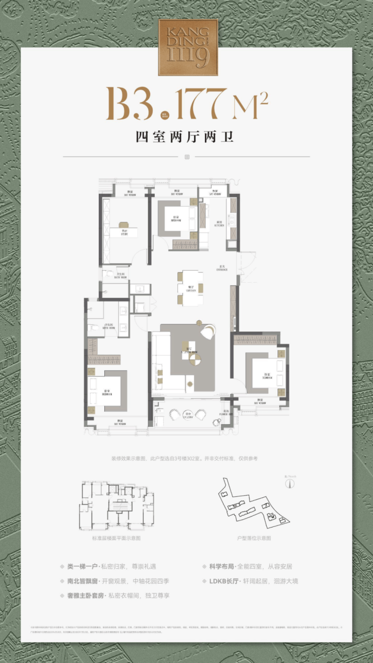 最重要的是,康定壹拾玖这建面约177㎡4房不仅仅是方正,更是飞机户型,三开间朝南+南北通透+无走道的浪费,整个户型相当正气。