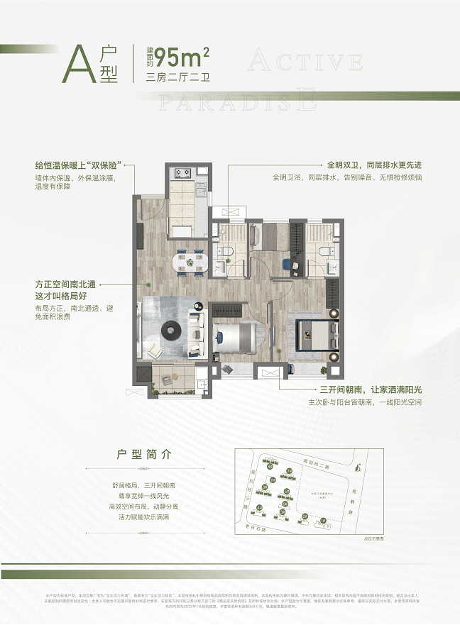 约95平三房两厅两卫,做到了三开间朝南+主卧套房设计+南北通透+动静分离+双朝南卧室带飘窗,是非常棒的3房户型!