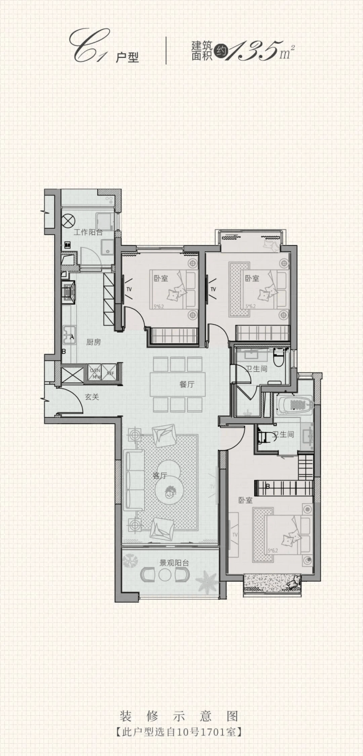 建面约135㎡灵动3房户型