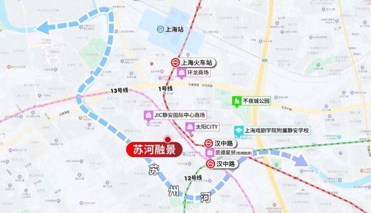 落位到具体交通,苏河融景步行可达(约200米)城心无比重要的十字交错站点——1/12/13号线汉中路站,进站后2站人民广场,2站南京西路、2站北外滩。