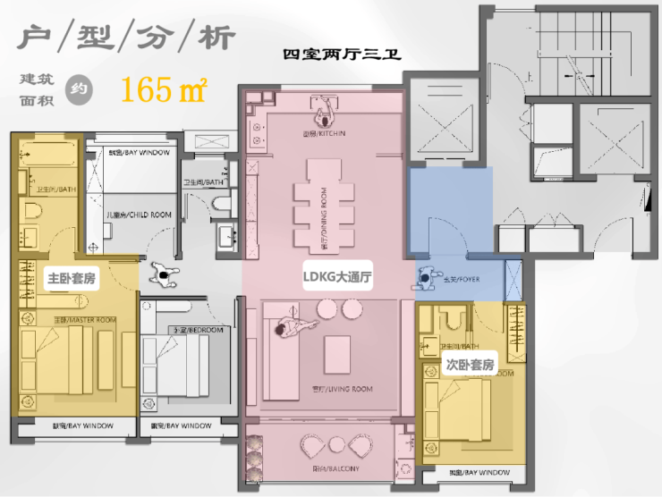 建面约167㎡的户型更加优秀,4房2厅3卫的设计。